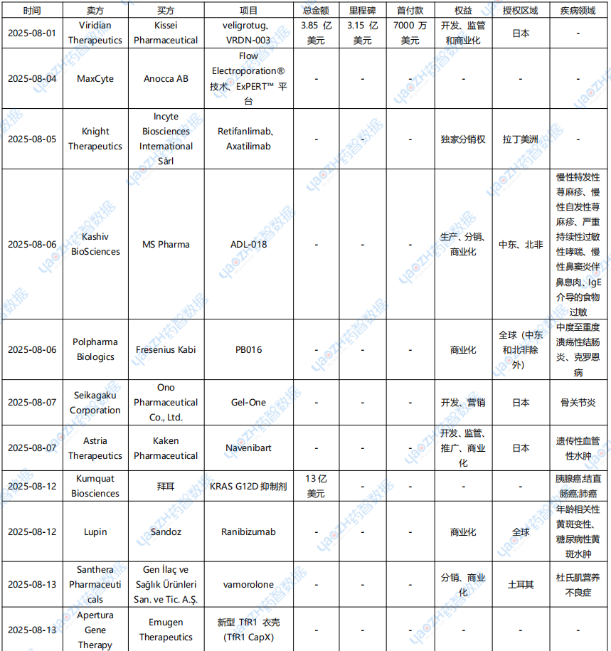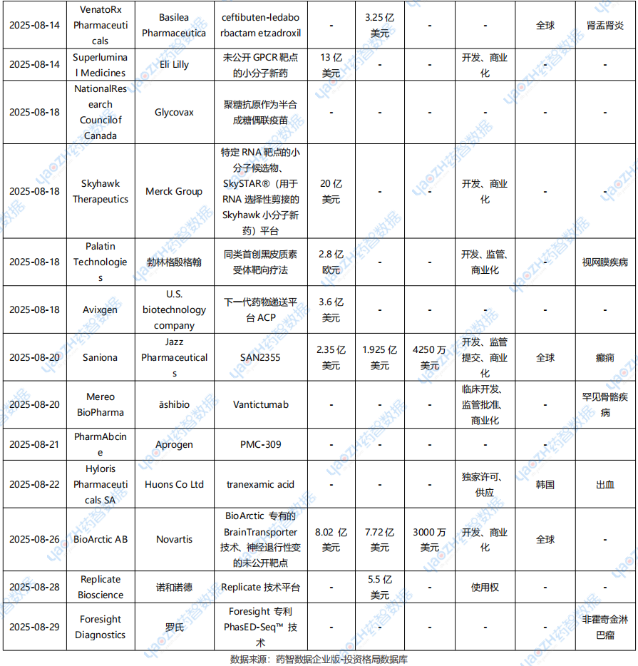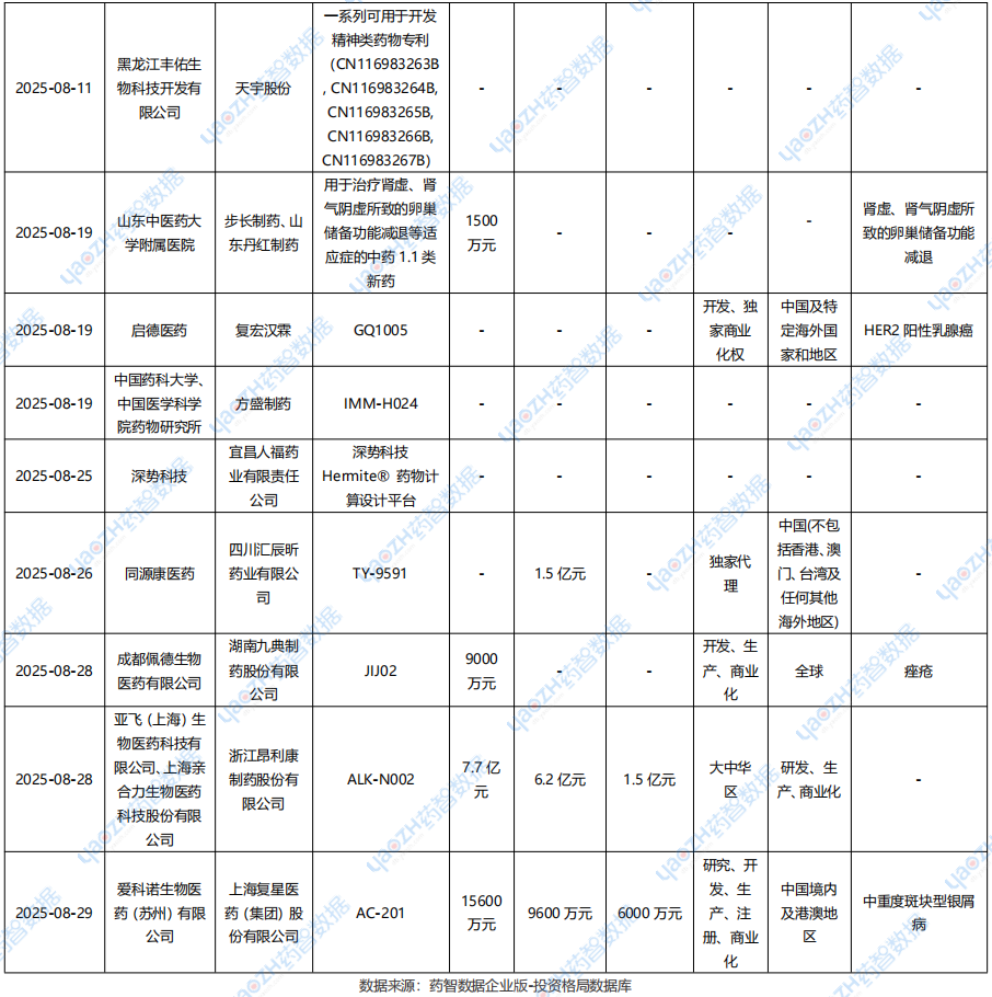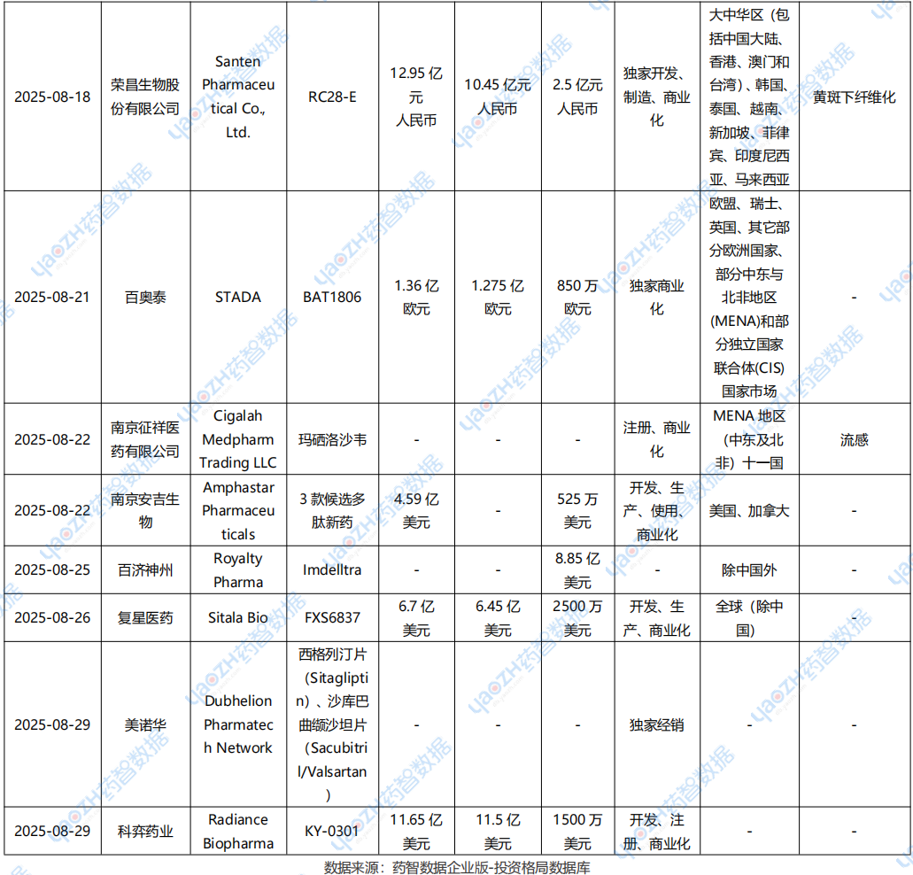 2025年8月,据药智数据不完全统计,全球医药市场共签署了115项资产授权和合作协议。中国市场授权交易共达成33项,包括15项出海交易、2项引进交易和16项国内交易。