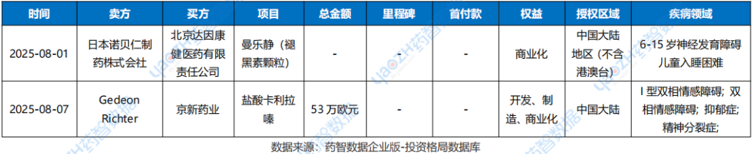 本月中国市场引进交易共发生2项,均未披露交易金额,交易包括睡眠障碍和抑郁症相关的神经系统疾病授权项目。随着资本市场回暖和国内医药需求不断释放,中国医药行业的 license-in 交易有望重新活跃。企业唯有夯实自身能力、秉持理性与专业,从全球甄选真正满足重大临床需求的创新产品,方能为本土市场持续注入“活水”,惠及更多患者。