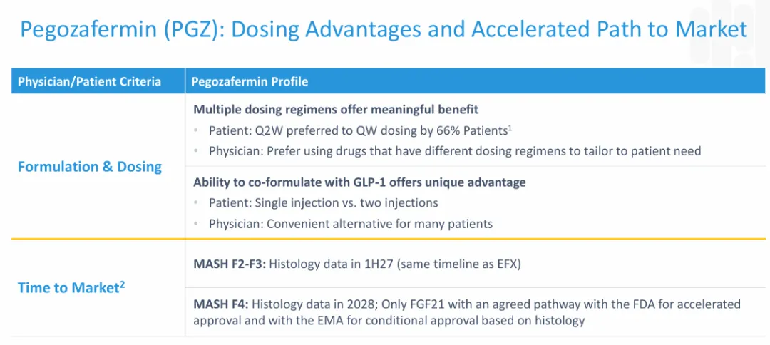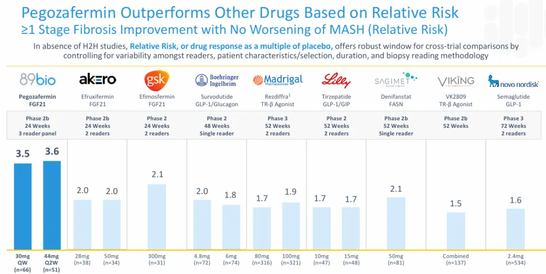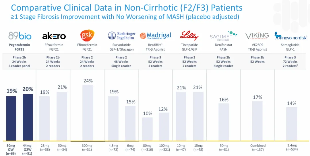89bio的pegozafermin是成纤维细胞生长因子21(FGF21)的糖蛋白化类似物,专门用于解决MASH中未满足的关键需求。凭借其抗纤维化和抗炎作用机制以及良好的安全性,佩戈扎夫明有望为患有中度至重度肝纤维化(F2/F3期)和肝硬化MASH(F4期)的患者提供最佳的疾病疗效。
