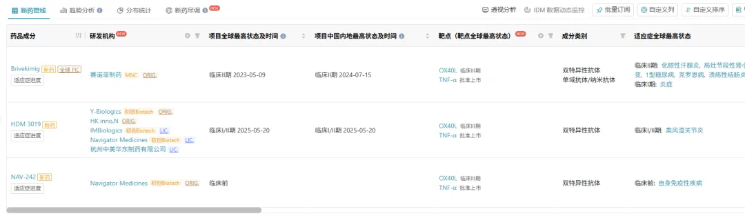 Insight 数据库显示,目前全球范围内共有 3 款 TNF/OX40L 双抗在研,Brivekimig 是全球进展最快的。