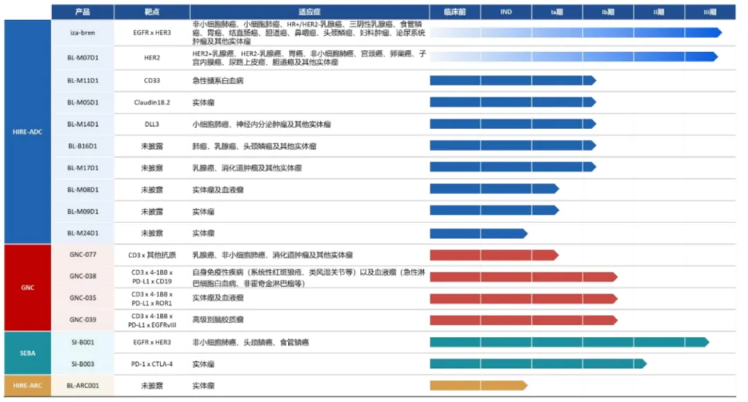 在双抗药物上,百利天恒布局了EGFR/HER3双抗SI-B001,其针对PD1经治的EGFRwt NSCLC末线,目前已进入临床III期。ADC药物上,百利天恒布布局了 BL-M07D1,M11D1等6款新药,其中BL-B07D1针对HER2+乳腺癌的早期数据展现出BIC潜力,目前已进入临床III期。
