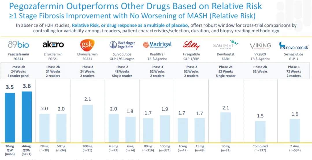 针对纤维化改善(定义为至少一个阶段的评分改善)且MASH不恶化这一主要终点,临床数据上pegozafermin没有太多优势,但pegozafermin纤维化改善相对风险高达3.6,表现出BIC潜质。