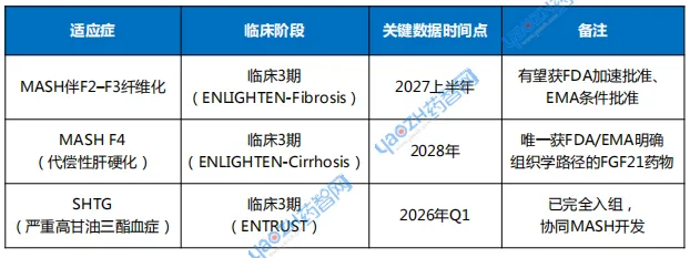 89bio预计,pegozafermin针对MASH伴F2-F3期纤维化患者的III期试验将于2027年上半年获得顶线组织学数据;针对代偿性肝硬化(F4)的MASH患者的III期试验预计2028年获得顶线数据。另外,针对严重高甘油三酯血症(SHTG)适应症,III期试验已完全入组,预计2026年第一季度获得顶线数据。