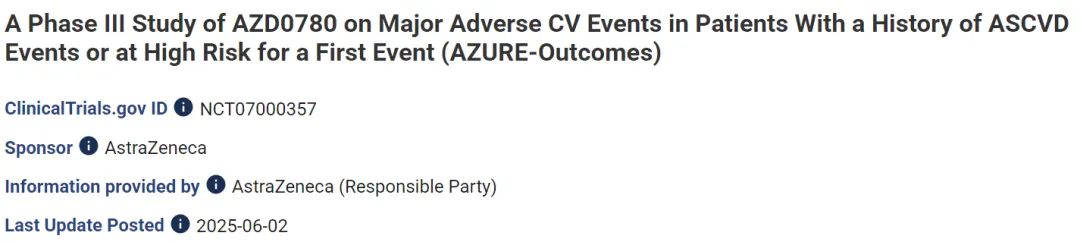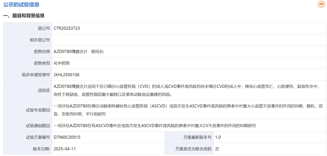 2025年9月19日,阿斯利康在药物临床试验登记与信息公示平台网站上注册了小分子PCSK9抑制剂AZD0780薄膜衣片用于已确诊CVD的成人或CVD事件高风险的成人中,降低心血管风险的中国三期临床试验。