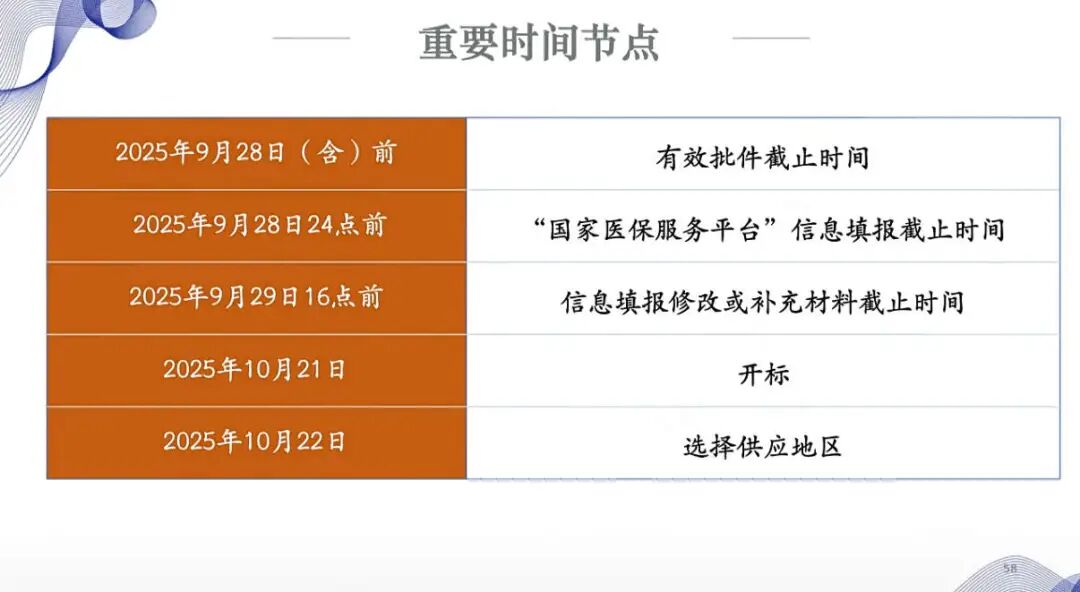 文件同时明确了企业申报的关键时间节点与操作要求。包括纳入集采范围的药品,须于9月28日(含当日)前取得国内有效注册批件,并按“基础信息填报截止时间”要求在 “国家医保服务平台”(fuwu.nhsa.gov.cn)完成信息填报。