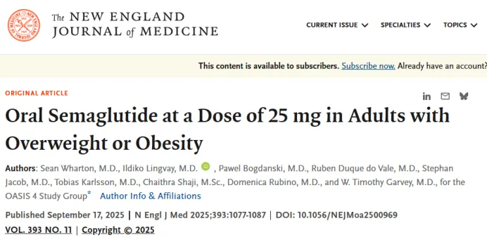 在全球肥胖症发病率持续攀升的背景下,有效且便捷的体重管理方案成为医学界与公众关注的焦点。近日,《新英格兰医学杂志》(The New England Journal of Medicine)发表了来自3期试验OASIS 4的结果:每日一次口服司美格鲁肽片25 mg(Wegovy®片剂)在肥胖或超重成人中实现了16.6%的平均体重减轻,且每3名受试者中就有1人减重超过20%。这一成果不仅标志着口服GLP-1疗法在肥胖症领域的重大突破,更可能重塑体重管理的临床实践格局。