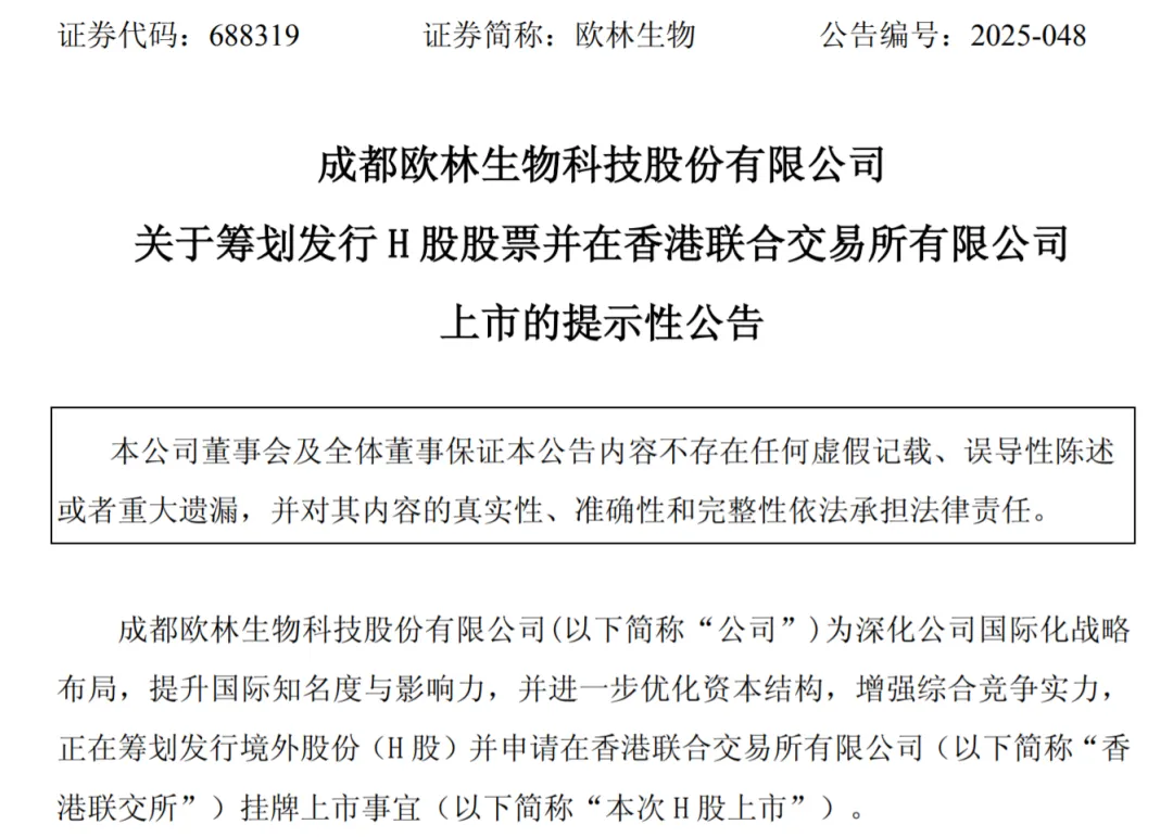 2025年9月24日,欧林生物发布关于筹划发行H股股票并在香港联合交易所有限公司上市的提示性公告。为深化公司国际化战略布局,提升国际知名度与影响力,并进一步优化资本结构,增强综合竞争实力,公司正在筹划赴港上市事宜。截至目前,公司正与相关中介机构就相关工作进行商讨,上市的细节尚未确定。