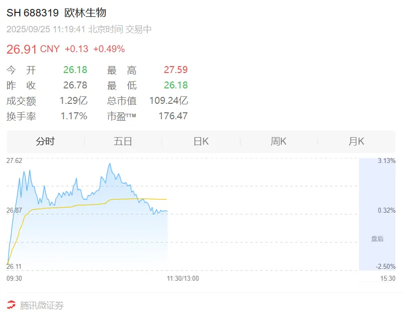 欧林生物主要从事人用疫苗的研发、生产和销售。公司于2021年在上交所上市,截至今日11:19,公司市值逾109亿元人民币。