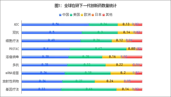 此外,在双抗、ADC、细胞疗法、多抗、溶瘤病毒、mRNA疫苗、放射性药物赛道上,中国的占比都超过了欧洲和日本。在基因疗法和PROTAC(蛋白降解剂)领域,中国也远超欧洲和日本,略低于美国。