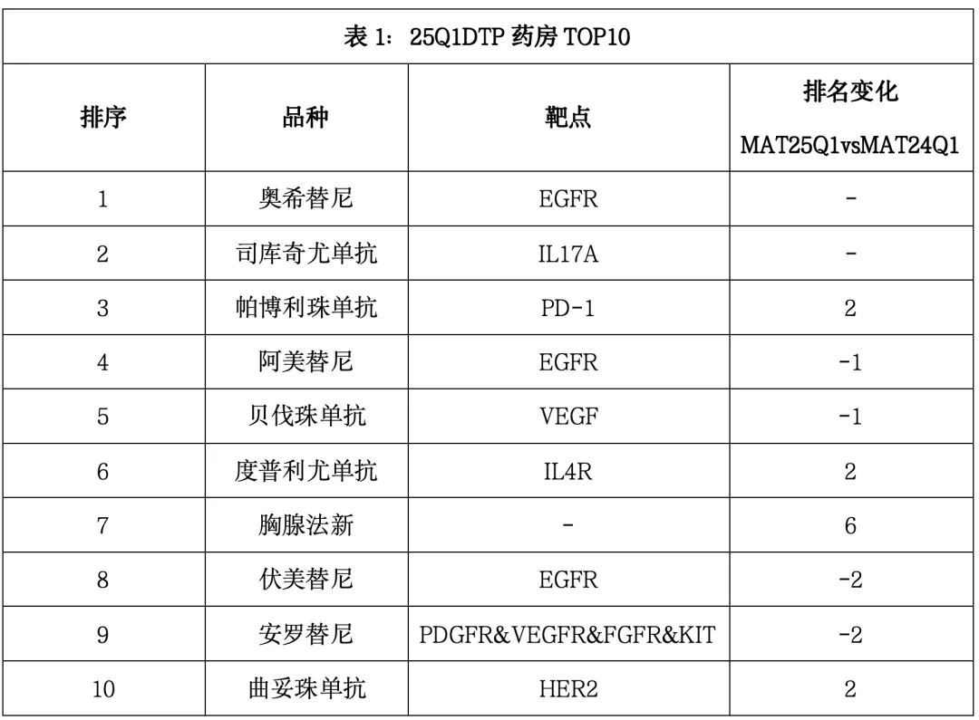 2025年第一季度DTP药房销售TOP10品种中,排名第一的是奥希替尼,EGFR靶点明星产品,主要用于治疗肺癌,保持稳定领先地位;排名第二的是司库奇尤单抗,常用于治疗银屑病等自身免疫性疾病;排名第三的是帕博利珠单抗,相比上一个周期排名上升2位,表现出色;度普利尤单抗和曲妥珠单抗排名也上升了2位;而阿美替尼、贝伐珠单抗、伏美替尼和安罗替尼的排名有所下降;胸腺法新的排名上升幅度最大——上升6 位,成为榜单“黑马”。