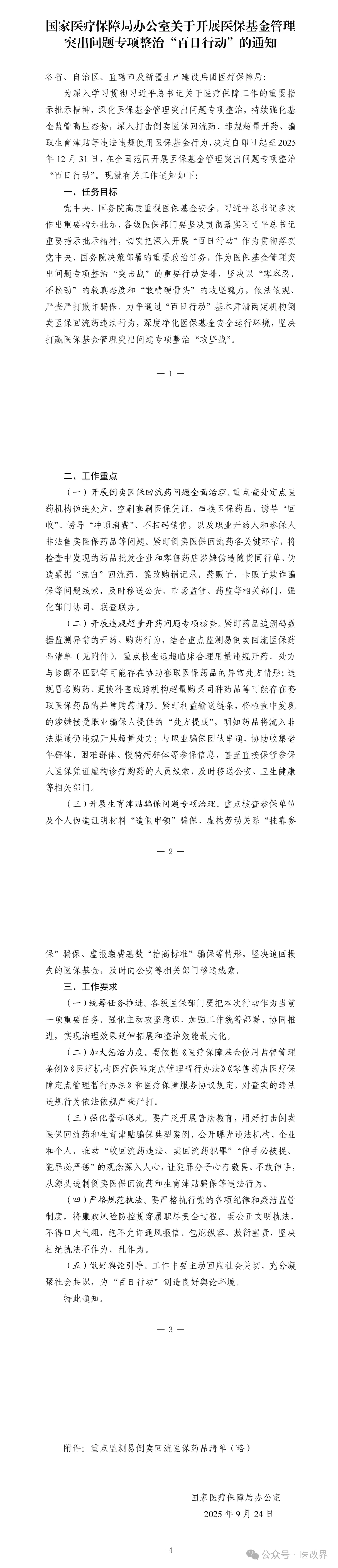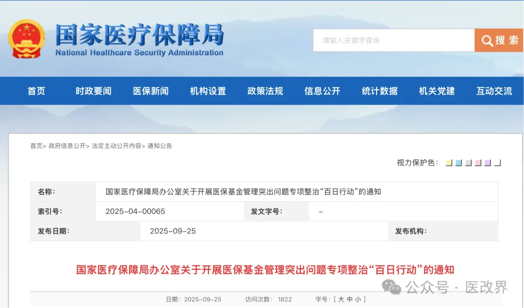 刚刚,国家医保局发布《国家医疗保障局办公室关于开展医保基金管理突出问题专项整治“百日行动”的通知》提出,自即日起至2025年12月31日,在全国范围开展医保基金管理突出问题专项整治“百日行动”。
