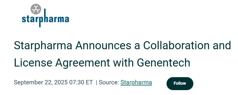 2025年9月22日,澳大利亚生物科技公司Starpharma宣布,与罗氏集团旗下 Genentech 签署合作与许可协议,双方将利用 Starpharma 的专有 DEP®(dendrimer-enhanced product)药物递送技术,联合开发一系列肿瘤新疗法。