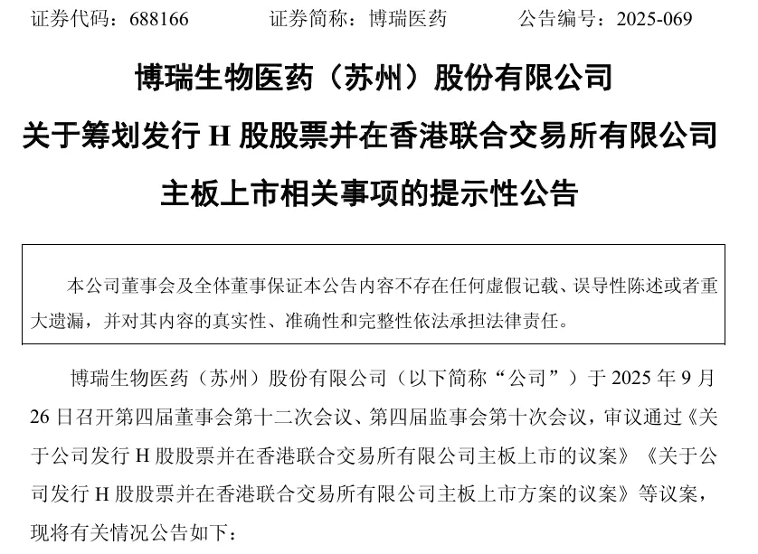 2025年9月27日,博瑞医药发布公告称,为加快公司的国际化战略及海外业务布局,增强公司的境外融资能力,进一步提高公司的资本实力和综合竞争力,公司拟发行H股股票并在香港联合交易所有限公司主板上市。