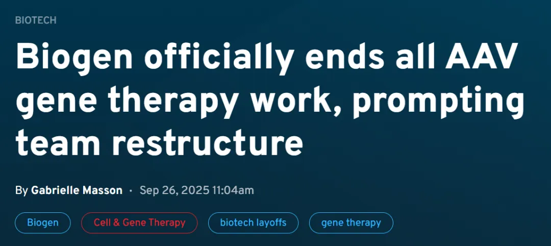 2025年9月26日,全球知名生物科技公司渤健(Biogen)正式宣布终止所有基于腺相关病毒(AAV)衣壳的基因治疗项目,这使得渤健成为近年来继辉瑞、罗氏、武田和Vertex之后,又一家放弃这项病毒载体递送技术的制药公司。