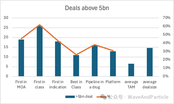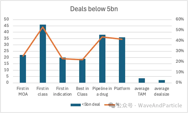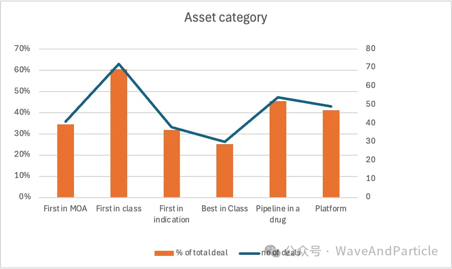 同时在大deal里,first in MOA和first in indiction的比例要远远高于小deal。也就是从侧面说明,一个MNC要做大deal,资产必须要有足够的独特性,而不仅仅是follow别人。new science一旦做出POC很容易被大药厂高价买掉。而best in class的资产从概率上说做大deal的概率要小很多。