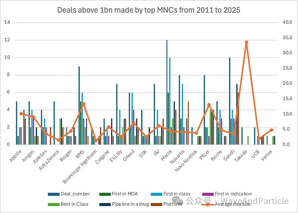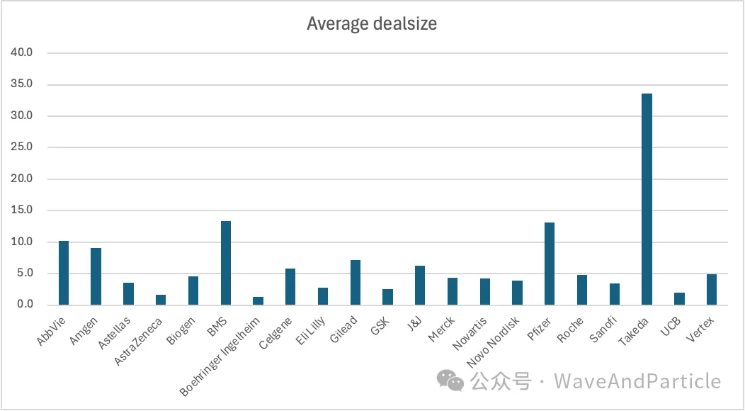 在三个average dealsize超过10亿美金的MNC里。BMS也非常喜欢买first in class。但是因为最近五年BMS买的first in class都有很多临床数据,甚至是已经做完三期的(比如KarTX),因此也期待未来这些资产能有所表现。但是,pfizer和abbv虽然average dealsize很大,但是在科学上他是保守的,不喜欢做first in class deal。但是仔细看过他们做的deal以后,就觉得很多时候这种保守反而是一种激进。就像铃木敏文在他讲7-11创业史里说的,有些时候剑走偏锋反而容易一事无成。从这些最大的deal上看,宁愿高价格买first in class,已经完成POC的资产,不要贪图便宜