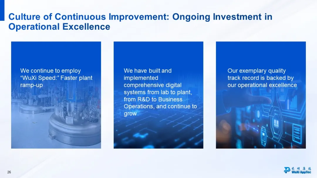 第二,数字化驱动的运营效率跃升。药明康德打造了全面的数字化系统,通过90多款应用系统,涵盖研发、生产、业务运营等各个环节,实现“智慧”运营,并且这些系统都在持续迭代。数字运营带来的效率提升,丝毫不逊于新产能扩张的贡献。