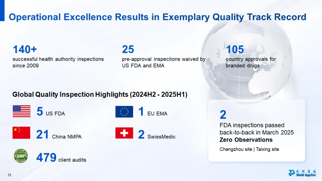 这种可持续的高质量标准已得到全球监管认可:常州基地曾在未提前通知的情况下,接受美国FDA对过往所有分子化合物的突击审计,最终零缺陷通过;泰兴基地的首个API(原料药)项目,即便团队、工厂、项目均为全新且工艺复杂,仍一次性通过FDA审计。