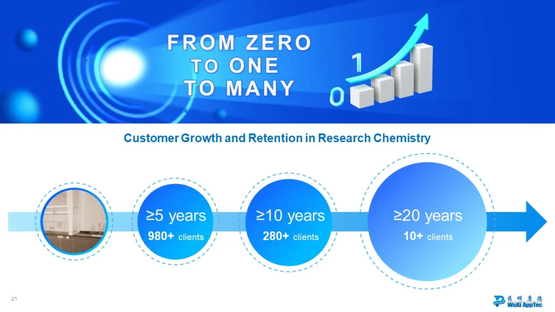 从2000年成立至今,药明康德已有25年发展历程,获得了诸多客户的信任,如与其研发化学服务部合作时间超过5年的客户超过980家,超过10年的接近300家。
