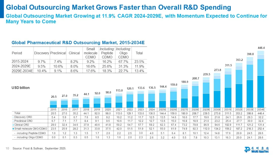 据预测,医药行业外包渗透率将从2024年的50%提升至2034年的65%,市场空间持续扩容。显而易见,药明康德所面临的“研发市场增长+外包渗透率提升”双重机遇,意味着其业务增量将远超医药研发行业的整体增量。