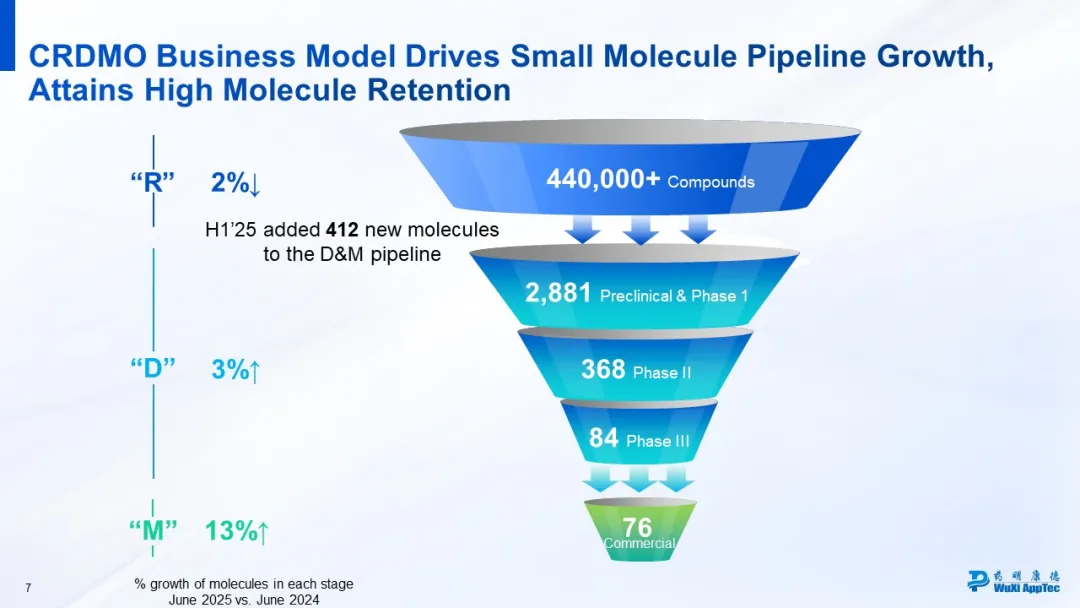 这一点也在订单和收入层面得到印证。订单层面,与2018年相比,如今药明康德用两倍增长的R端在手订单,带来了17倍增长的D&M端订单;合作分子层面,药明康德临床3期在研和商业化阶段的小分子项目,从2022年的107个增长到2025年上半年的160个,增长50%,推动相应收入增长超过150%。
