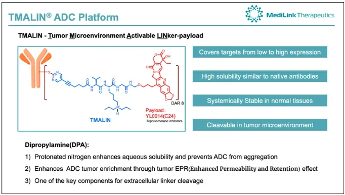TMALIN®利用肿瘤微环境和溶酶体在胞外胞内实现双重裂解机制,具有高水溶性、高均一性、高体内外稳定性以及肿瘤组织富集特性。