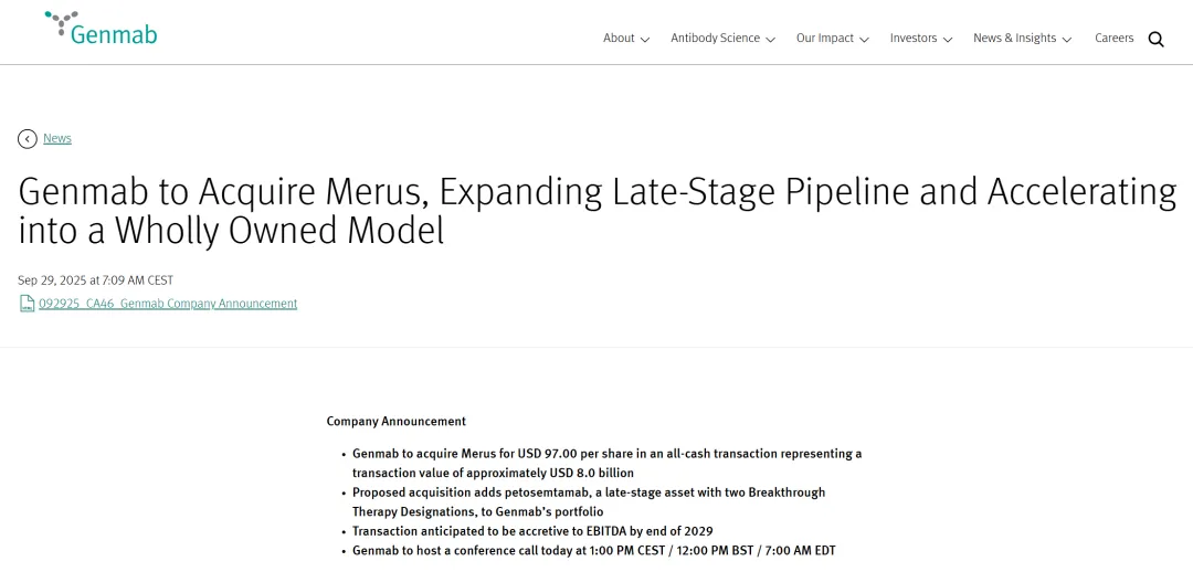 昨日(9月29日),Genmab宣布以每股97.00美元的全现金方式收购Merus NV,交易总价值高达80亿美元。这一收购不仅是Genmab自成立以来的最大一笔交易,更是其向全球生物技术领导者转型的重要一步。