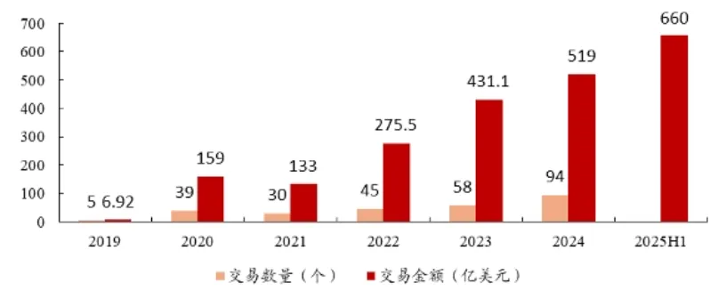 MNC资产荒造就创新药对外BD高峰。2025年上半年中国创新药对外BD总金额达到创历史的660亿美元,背后的历史背景一方面是MNC在面临专利到期以及创新药部分赛道有可能诞生改变行业规则的疗法下,“不得不”向全球临床管线数量第二的中国市场寻求合适的管线。另一方面则是中国创新药部分企业已经在某些创新药领域取得了具有世界级创新的分子设计,虽然更多的仍旧是在已经初步验证的分子上进行工程化创新。但是中国工程师的高效以及相对低成本,依旧赋予了创新药企业全球范围内无与伦比的竞争力。