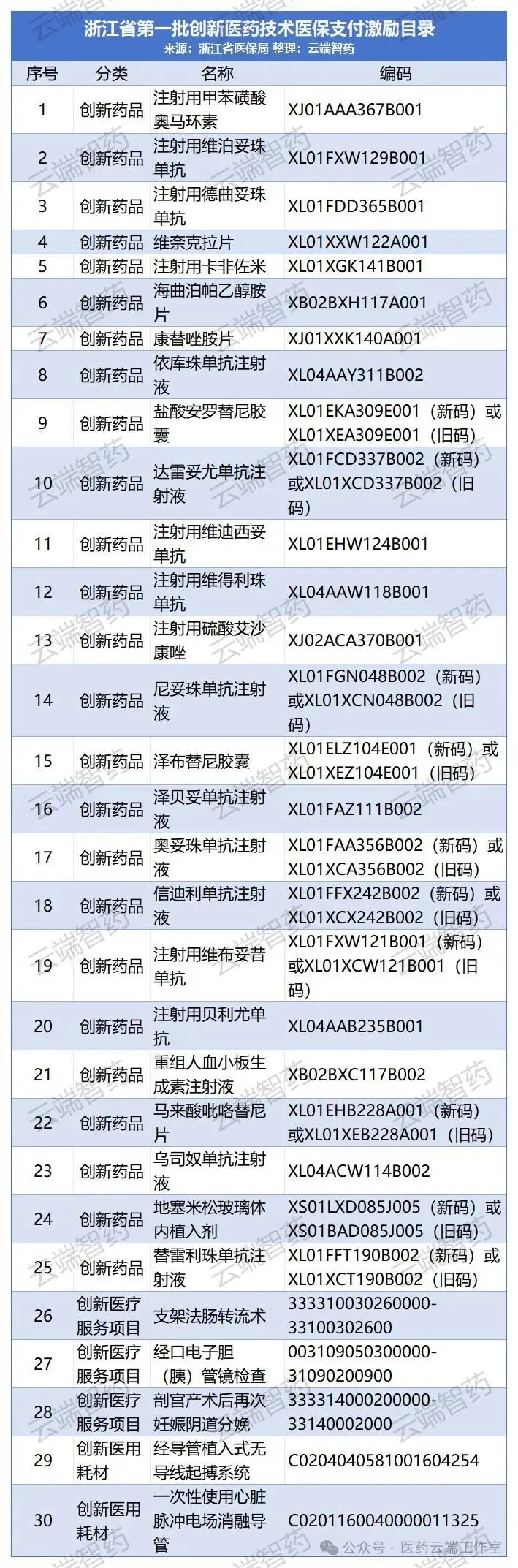 根据《浙江省人民政府办公厅关于印发浙江省全链条支持创新药械高质量发展若干举措的通知》(浙政办发〔2024〕44号)《浙江省医疗保障局关于印发浙江省创新医药技术医保支付激励管理办法(试行)的通知》(浙医保发〔2024〕17号)文件要求,经自主申报、形式审查、专家评审,公示等程序已形成第一批医保支付激励目录(见文末表格)