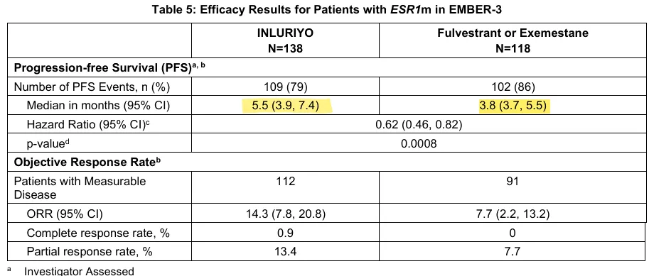 礼来Inluriyo聚焦于ESR1突变亚群,采用每日一次的口服给药方式,极大地提高了用药的便利性。在III期EMBER-3试验中,与标准内分泌治疗相比,Inluriyo将疾病进展或死亡风险降低了38%。在携带ESR1突变的患者中,与氟维司群或依西美坦相比,Inluriyo相较于氟维司群或依西美坦显著改善了无进展生存期 (PFS),中位PFS为5.5个月 vs 3.8个月。