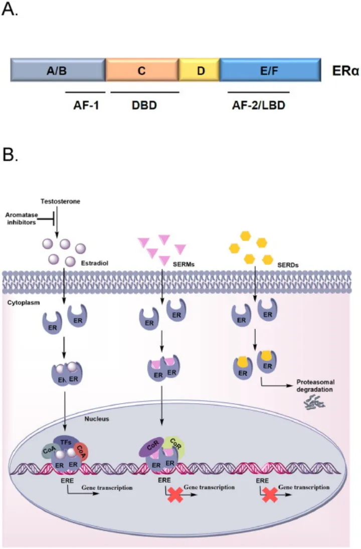 当然,要说内分泌治疗里的王炸,那应该就是氟维司群了,它也是最早的SERD。这里科普一下SERD和SERM的差别。SERM 是抗雌激素药物,旨在与雌激素竞争,并通过改变与其结合的辅因子来调节雌激素受体的活性。简单来说,雌激素结合的雌激素受体允许悬垂侧链12(H12)将配体封闭在配体结合口袋中,从而打开AF-2 裂隙,使共调节因子能够通过典型的LXXLL 基序与该裂隙结合。而SERM化学分子的侧链会导致螺旋11和12之间的构象变化,阻止H12 封闭配体结合口袋,这导致 H12模拟某种相互作用相互作用来阻塞共激活因子识别槽。这种相互作用阻止了辅激活蛋白的结合,从而阻断了受体的激活。