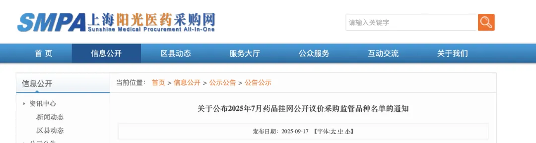 9月17日,上海阳光医药采购网发布《关于公布2025年7月药品挂网公开议价采购监管品种名单的通知》,10个药被纳入重点监控(具体名单见文末附件)。