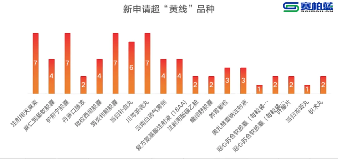 新申请超“黄线”品种按超黄线幅度降序排列,注射用天麻素、护肝宁胶囊、消炎利胆胶囊以及川芎茶调丸均被点名过7次。