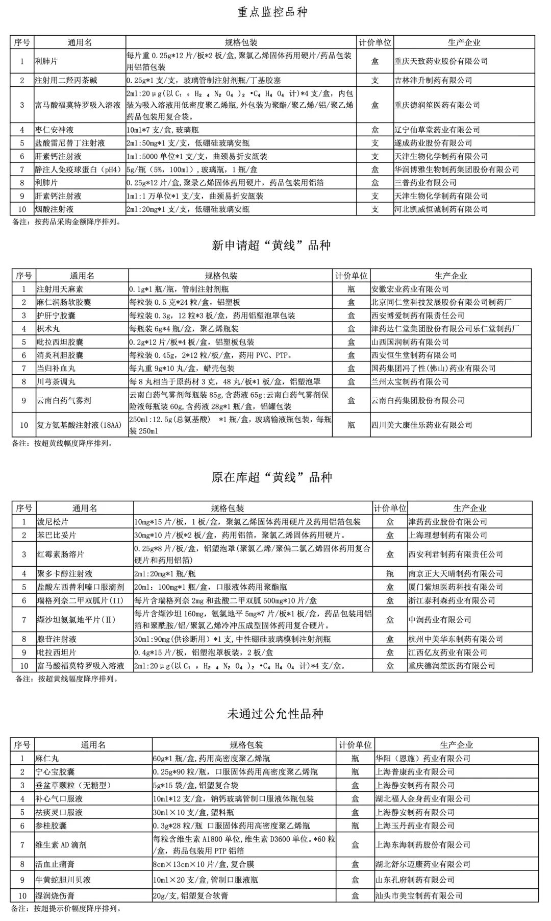 未通过公允性品种按超提示价幅度降序排列,其中垂盆草颗粒(无糖型)已经被点名过7次,湿润烧伤膏属于此次新增被点名的药品。