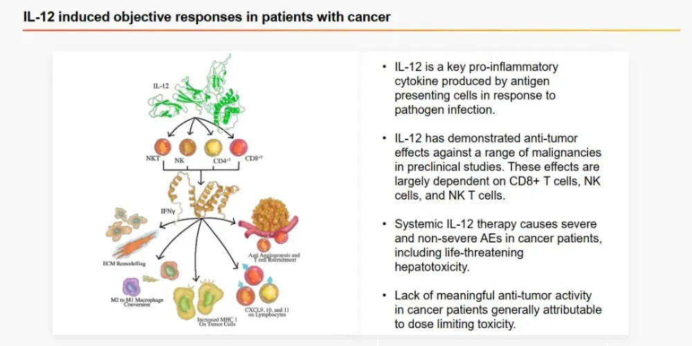 XTX301是一款IL-12前体药(pro IL-12),被设计为仅在肿瘤局部激活免疫反应,限制在非肿瘤组织中活性IL-12的暴露,从而提高其治疗指数。