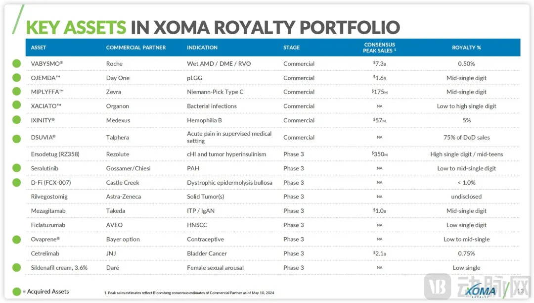 简单来说,XOMA希望通过自己数十年对研发药物的理解来评估管线资产,收购处于临床阶段或已上市药物的未来里程碑付款和销售分成权益。通过一次性支付现金,XOMA 获得这些资产未来产生的现金收益,而卖方Biotech既可以获得非稀释性融资并负责继续推进项目,也可以选择停业回收部分成本。