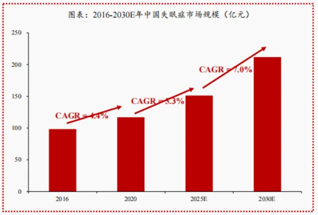 这就导致失眠药物仅仅占到了一小块市场空间。据沙利文测算,中国失眠症药物市场规模2020年大概117亿元,到2025年预计151亿元,到2030年预计212亿元,期间(2025-2030)CAGR将达7%。