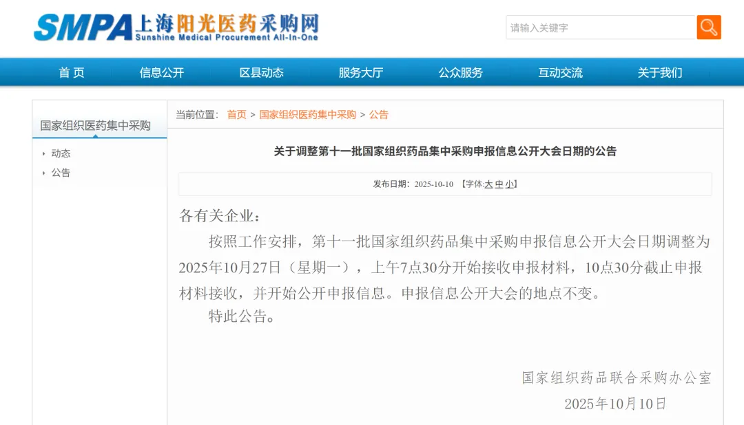 按照工作安排,第十一批国家组织药品集中采购申报信息公开大会日期调整为2025年10月27日(星期一),上午7点30分开始接收申报材料,10点30分截止申报材料接收,并开始公开申报信息。申报信息公开大会的地点不变。