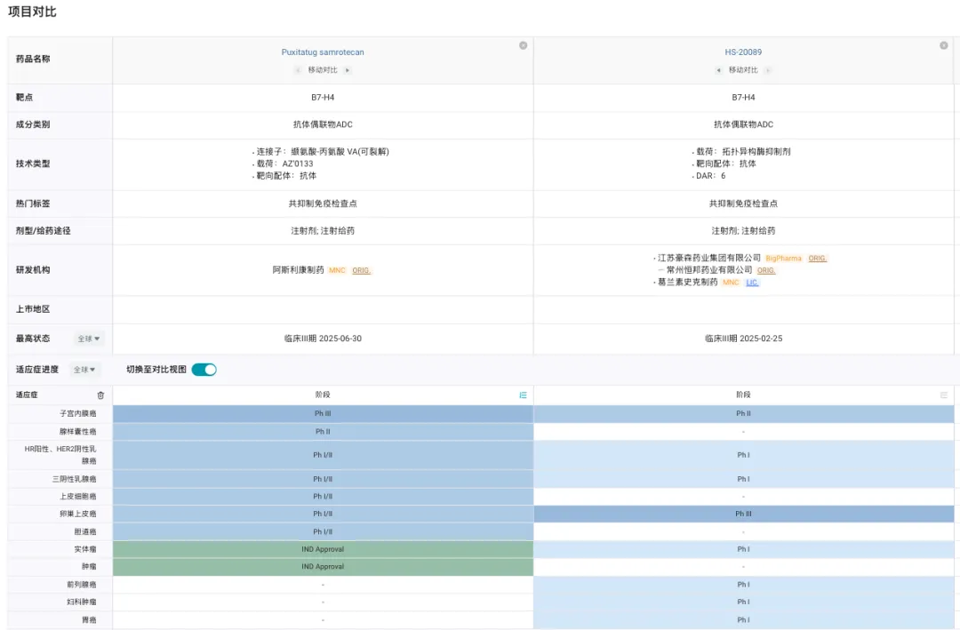 除了疗效外,辉瑞放弃 Felmetatug vedotin 或许与 B7H4 ADC 的竞争格局也有关系。Insight 数据库显示,全球在研的临床 B7H4 ADC 共有 7 款,其中阿斯利康的 Puxitatug samrotecan 和翰森制药的 HS-20089(GSK 拥有中国以外的全球开发和商业化权益),已经推进至 III 期临床,前者适应症为子宫内膜癌,后者为卵巢上皮癌。