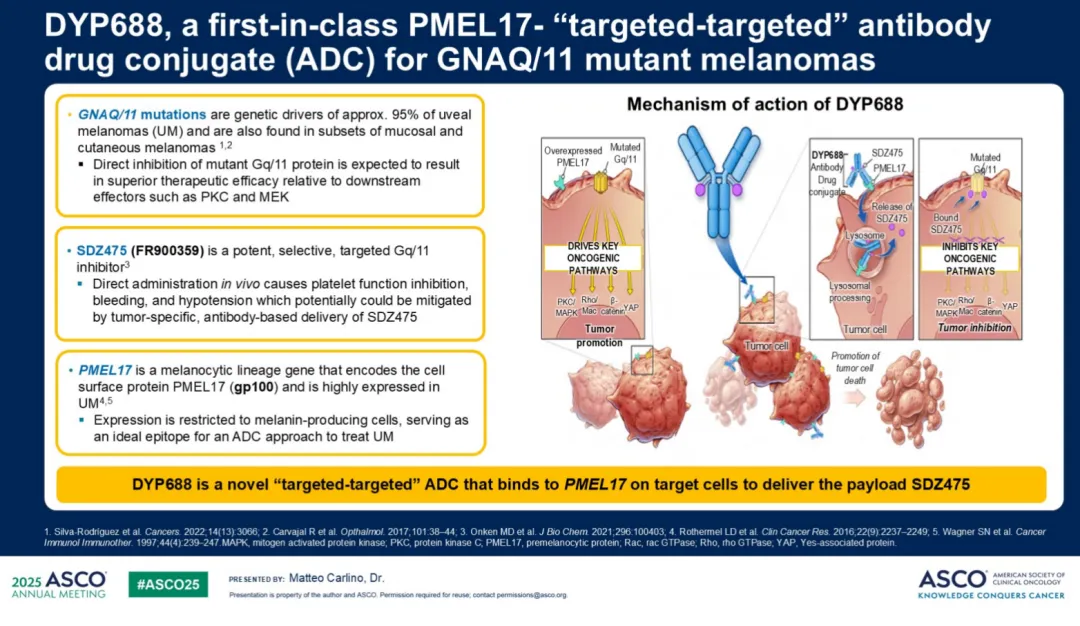 诺华在 ADC 领域布局不多,2024 年 5 月出于商业、战略和发展考虑终止 CCR7 ADC 产品 JBH492 开发,只有一款全球首创 ADC DYP688 正在开展临床研究。公开资料显示, DYP688 可与 PMEL17 结合,递送 GNAQ/11 抑制剂 SDZ475。