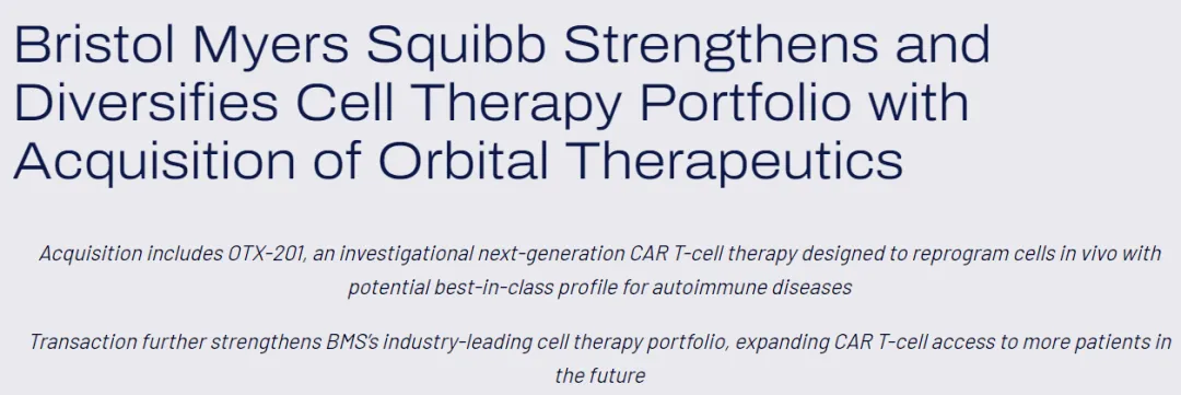 10月10日,百时美施贵宝(BMS)宣布将以15亿美元现金收购和Orbital Therapeutics,Orbital开创了新一代RNA药物,可在体内对免疫系统进行重新编程,使治疗能够提供解决每种疾病的潜在生物学和独特复杂性所需的精确性、控制性和灵活性。