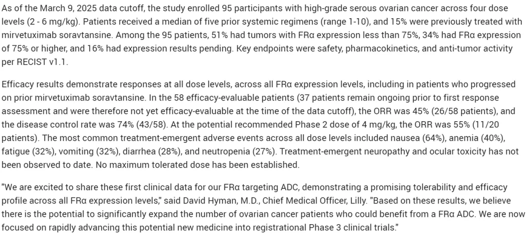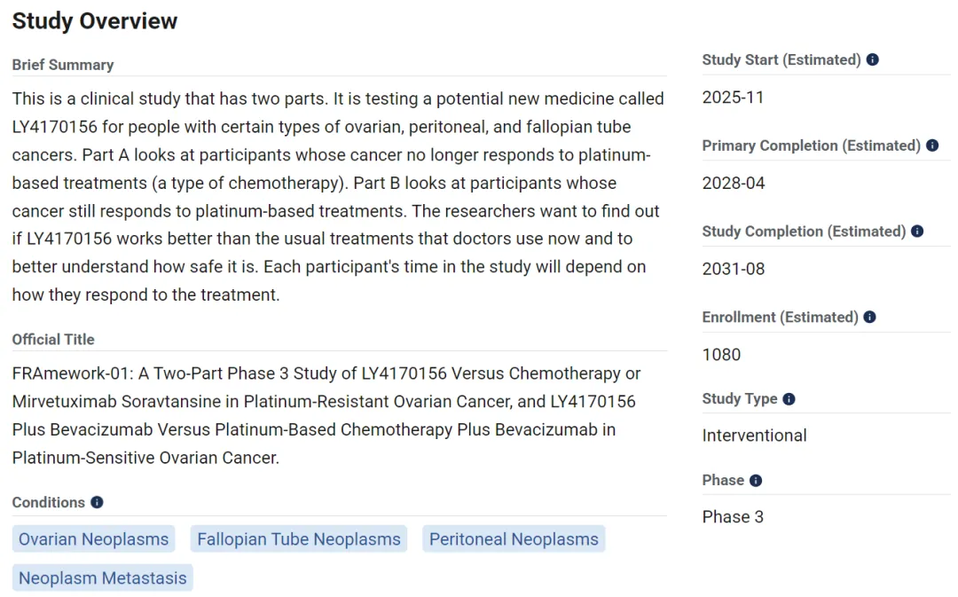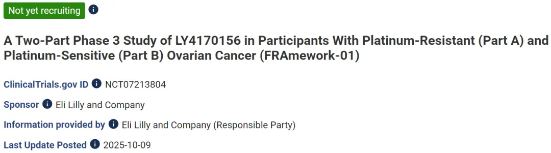 2025年10月9日,礼来在Clinicaltrials.gov网站上注册了FRα ADC新药LY4170156治疗铂耐药或铂敏感卵巢癌的三期临床试验FRAmework-01。