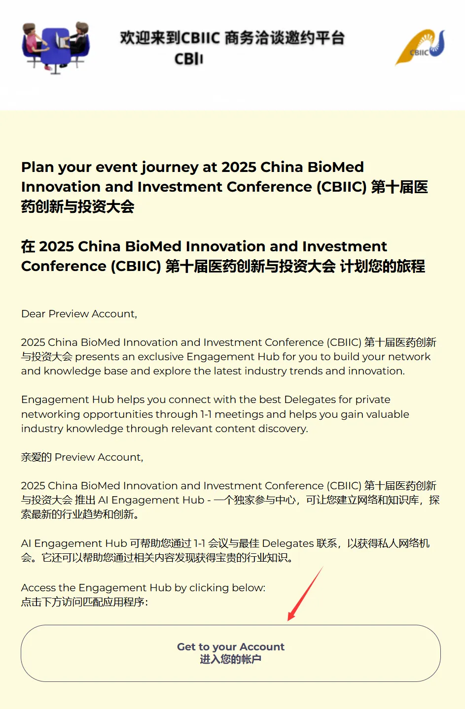 一对一商务洽谈邀约平台上线后,您的注册邮箱将收到邀请邮件,请点击【进入您的账户】进入一对一企业商务洽谈邀约系统,手机和电脑端均可使用。