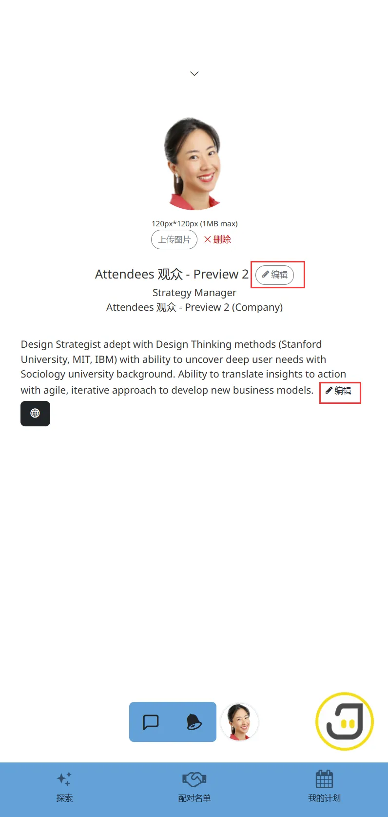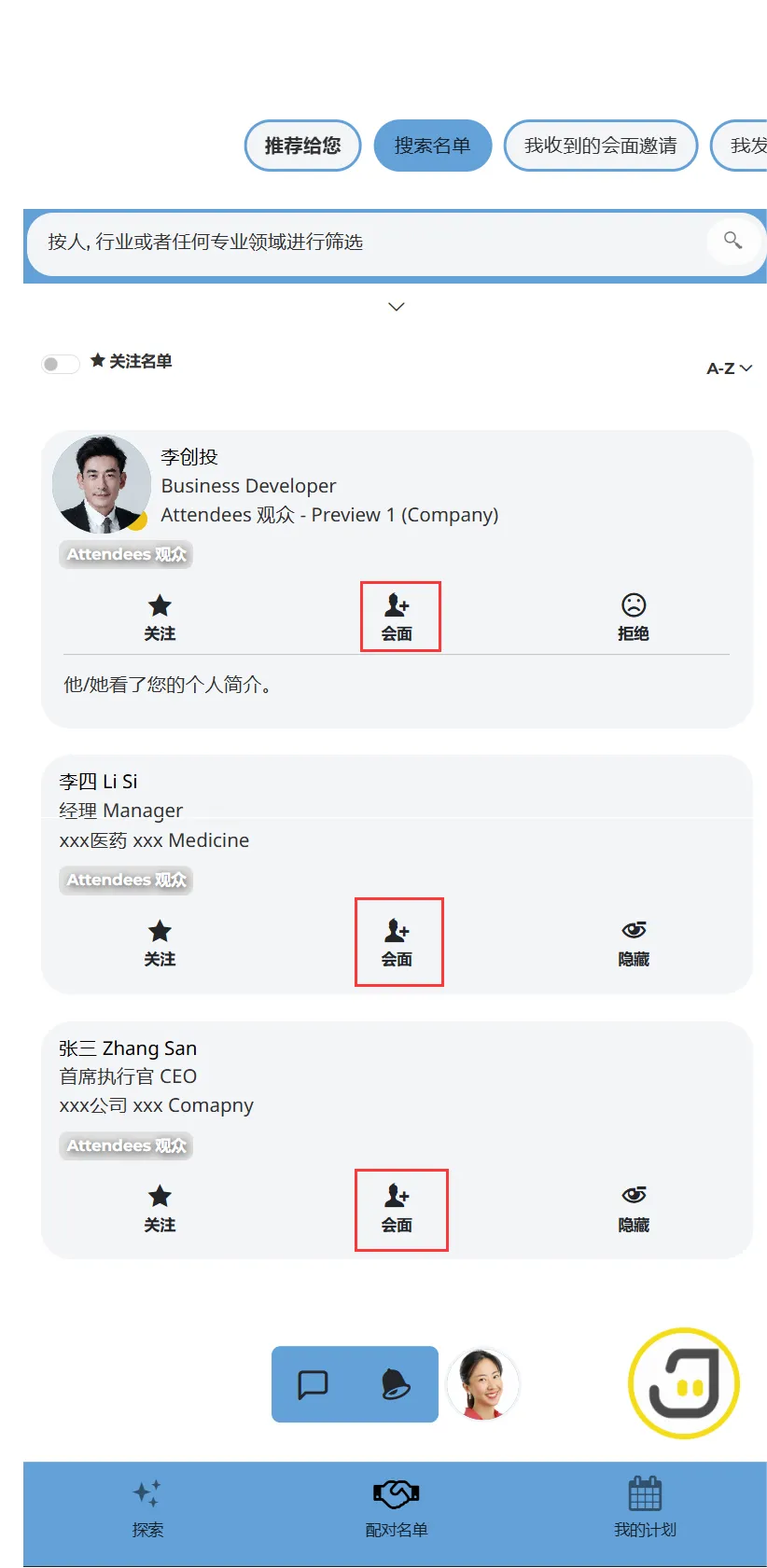 在搜索栏进行检索,或在分类列表选择您感兴趣的筛选条件,系统将帮您找出合适的预约方。在您登录平台后,系统通常会把适合与您会面的参会者列在前面。若您需要对某个参会者进行会面邀约,可点击此参会者下方的【会面】按钮。
