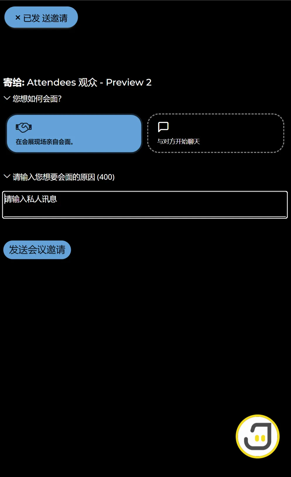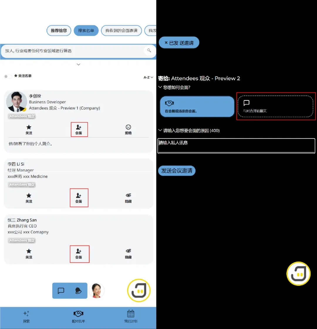 若您对某位参会者有洽谈的意向,您可以选择与对方会面的具体形式。确认好会面形式并输入会面原因后,点击【发送会议邀请】,等待对方回复。
