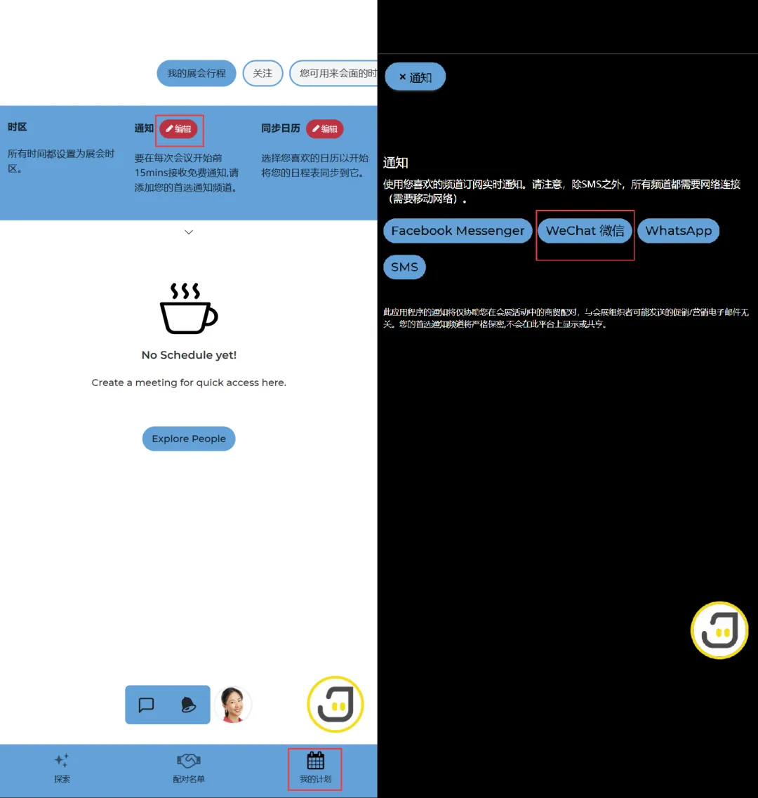 在首页点击【我的计划】——点击通知旁的红色【编辑】按钮——点击【Wechat微信】——使用微信扫描二维码进行绑定。绑定后,可第一时间收到相关的邀约通知。
