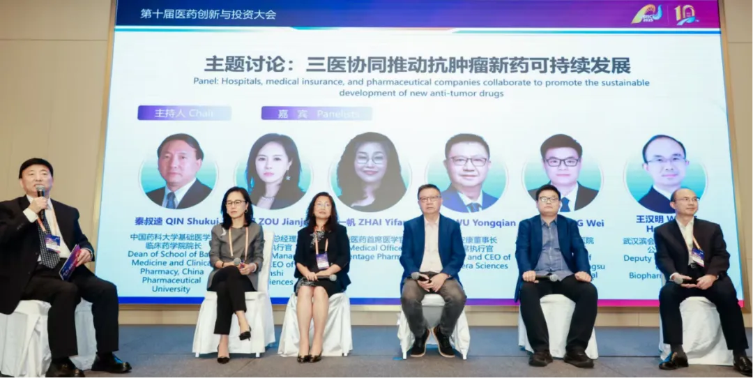 最后的主题讨论“三医协同推动抗肿瘤新药可持续发展”环节,由中国药科大学基础医学与临床药学院院长秦叔逵主持,君实生物总经理兼首席执行官邹建军、亚盛医药首席医学官翟一帆、药捷安康董事长兼首席执行官吴永谦、江苏省肿瘤医院副主任医师彭伟、武汉滨会生物科技股份有限公司副总经理王汉明共同参与讨论。邹建军强调“0到1”创新的挑战性,需中长期布局高尖端领域和AI驱动的药物研发,并在支付体系方面建议创新多元支付方案解决抗肿瘤药物临床准入难题;翟一帆呼吁深化医研企合作,以病人为中心避免单药局限性,并指出AI加速研发的关键挑战是临床试验数据的全球接受度;吴永谦结合自身经历强调转化医学的核心作用,临床医生早期介入能精准定位需求,他呼吁打破学科壁垒以机制创新推动药物源头创新;彭伟聚焦肿瘤全程管理,提出重点在支持治疗中提升患者生活质量,呼吁通过智能化平台、复合药物设计和政策组合,确保患者从“活得更长”到“活得更好”;王汉明介绍溶瘤病毒在实体瘤治疗的安全性优势临床进展,强调联合疗法潜力。他指出国内创新药需借助国际合作,并期待与临床科研组织协作优化临床路径。秦叔逵在总结中呼吁未来加强临床与产业的合作,推动更高效的新药上市机制,践行“健康中国”理念。