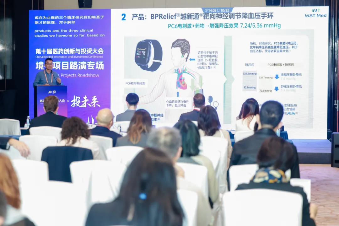 董事长纪华雷先生介绍,该设备利用AI边缘算法与靶向神经调节技术,通过精准刺激外周神经实现个性化降压调控,临床验证显示显著降低血压并减少药物依赖。越凡医疗依托中加两地研发优势,正推动临床验证与市场准入,为全球高血压防治提供创新解决方案。