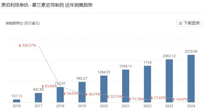 在竞争日益激烈的生物制剂市场,美泊利珠单抗凭借其每月一次的给药频率,相较于主要竞品度普利尤单抗(每两周一次)在患者依从性上展现出差异化优势,且美泊利珠单抗聚焦嗜酸性粒细胞通路,联合用药潜力受关注。尽管还面临阿斯利康贝那利珠单抗(每八周一次)等后起之秀的挑战,美泊利珠单抗凭借其在中国的先发优势以及在联合用药方面的潜力,依然保持着强大的市场竞争力。2025 年前三季度,该产品全球销售额约 19.01 亿美元,随着 COPD 新适应症的放量,未来增长可期。