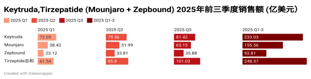 图1. Keytruda与Tirzepatide 2025年前三季度销售额对比。